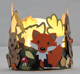 Ik stanste de mal twee keer uit, ik zorgde ervoor dat de strook papier aan elkaar bleef zitten. Achter de blaadjes plakte ik verschillende kleuren vellum, vliegerpapier had ik helaas niet maar dit geeft hetzelfde effect. Hierna plakte ik de twee uiteinden aan elkaar zodat het rondje ontstond. Het versieren kon beginnen en ik nodige een aantal bosdiertjes van Eline uit. Ook de mooie gekleurde herfstbladeren, paddestoelen en pompoenen konden niet ontbreken.